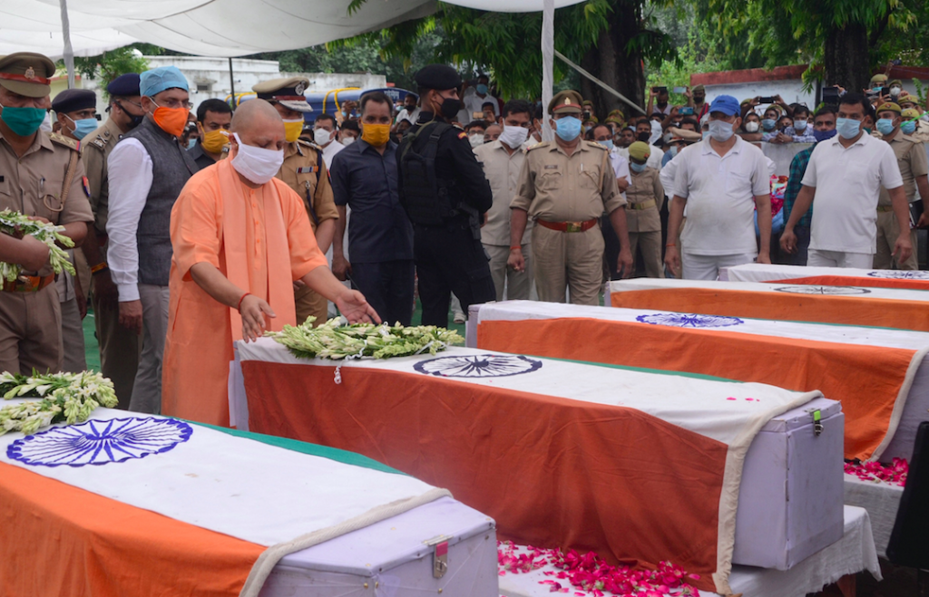Uttar Pradesh Chief Minister Yogi Adityanath pays tribute to policemen who lost their lives in an encounter at Bikaru village, at Police Line in Kanpur, Friday, July 3, 2020. Photo: PTI