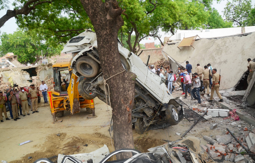 An earthmover vehicle is used to remove mangled remains of a car during the demolition of the residence of criminal Vikay Dubey, after an encounter in Bikaru village where 8 police personnel lost their lives, in Kanpur, Saturday, July 4, 2020. Photo: PTI