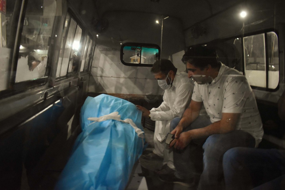 Makhan Lal Bindroo's son (first from right) with his body. Photo: Faizan Mir