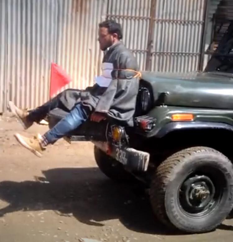 Video grab of Farooq Ahmed Dar tied to the bonnet of the Major Leetul Gogoi's jeep as a 'human shield'.