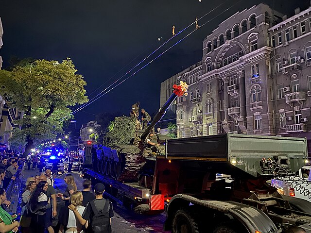 A crowd in Rostov-on-Don watching a Wagner tank with flowers sticking out of its muzzle. Photo: Fargoh/Wikimedia Commons, CC0