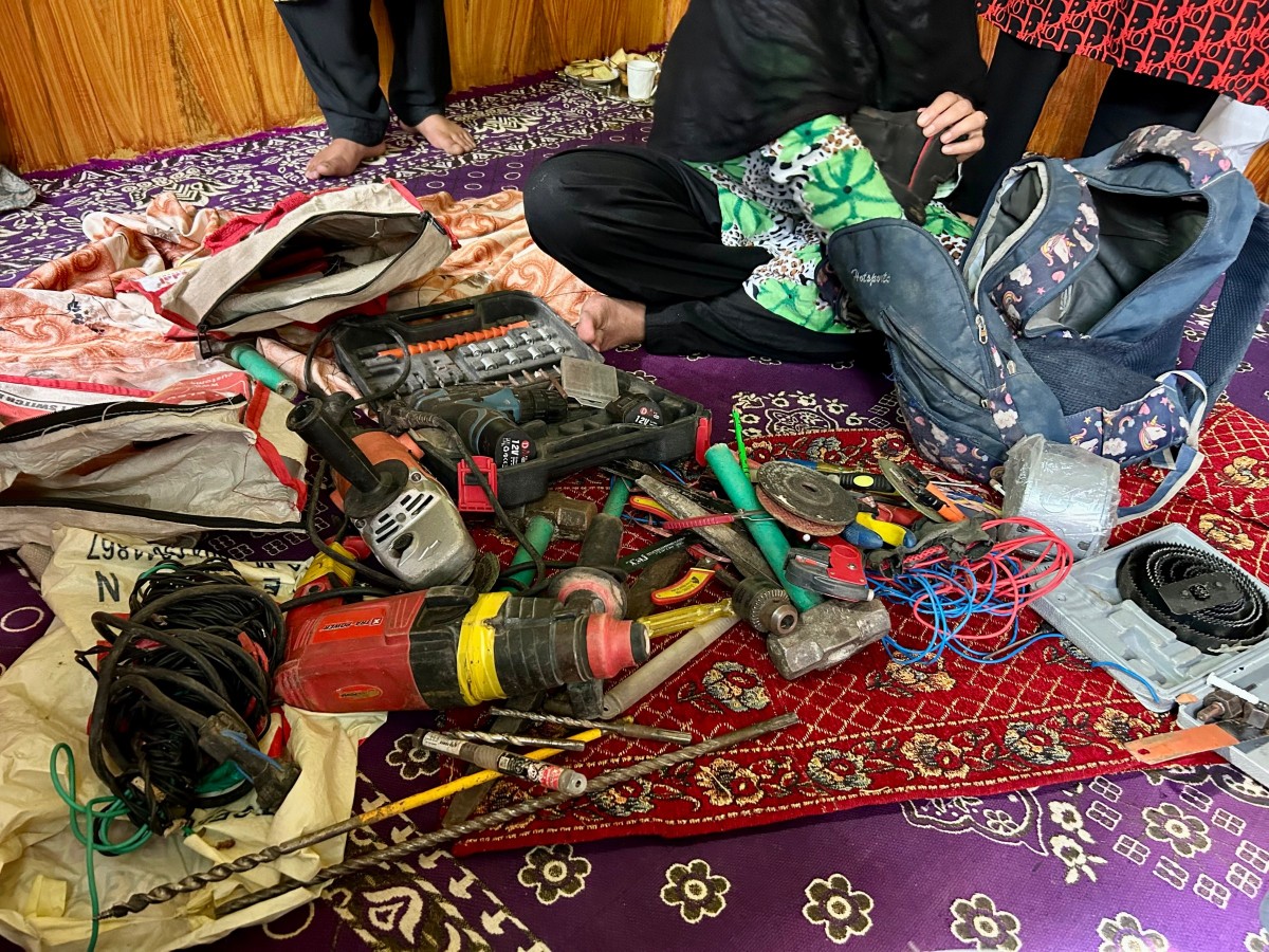 Uzair’s aunt showing the tools which were used by him during his days as an electrician before joining militancy. Photo: Jehangir Ali