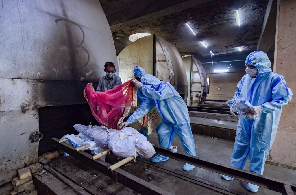Relatives perform last rites of a family member who died of COVID-19 in New Delhi, June 14, 2020. Photo: PTI/Manvender Vashist