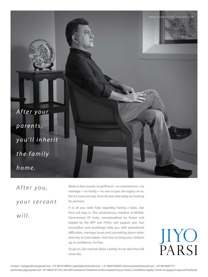 Unmarried, middle-aged folk in the ads look sad and lonely, with wistful expressions, contemplating joyless lives. While the elderly man depicted in the ad campaign is about to lose his property (to his ‘servant’), the single woman has no one to backslap while watching Parsi plays. The hint of a sad smile plays on her thin, pursed lips, as she sits on a chair by herself, a vacant look in her eyes. For what else do single men and women do, besides sitting on very well-polished chairs and brooding silently by themselves.