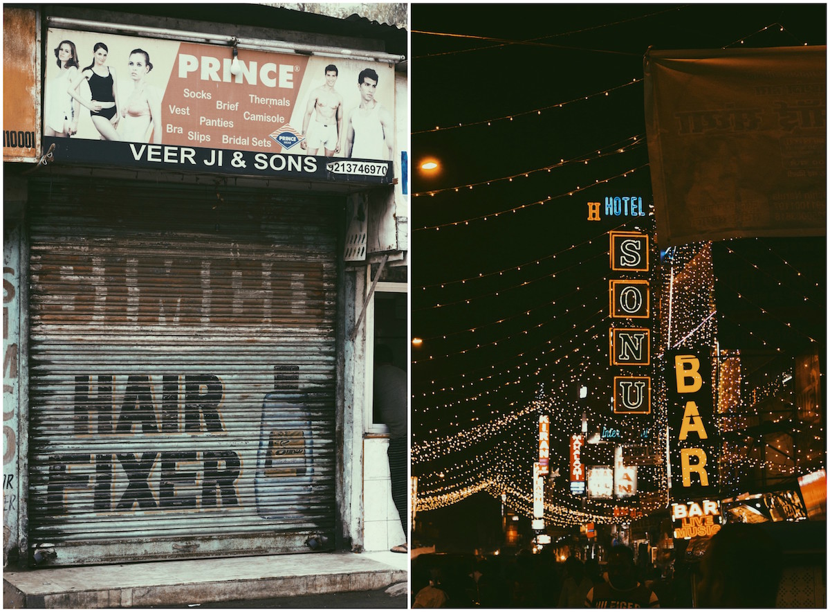 Left: An advertisement painted on a garage in Gole market. Right: Bars and hotels are abundant in Paharganj. In the background, printed flex signboards can be seen, competing with their neon counterparts.