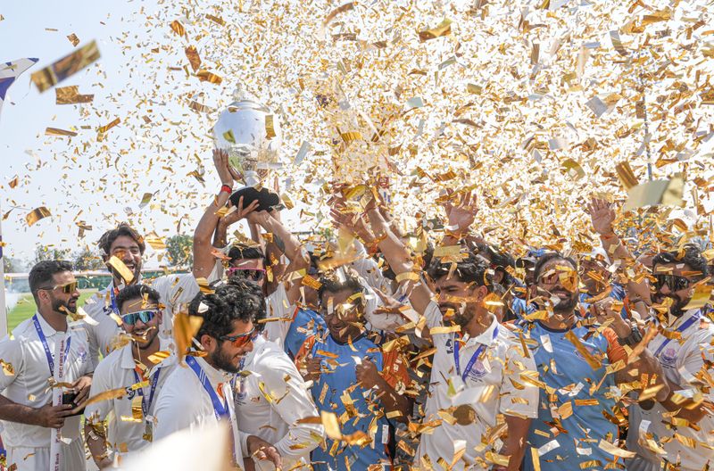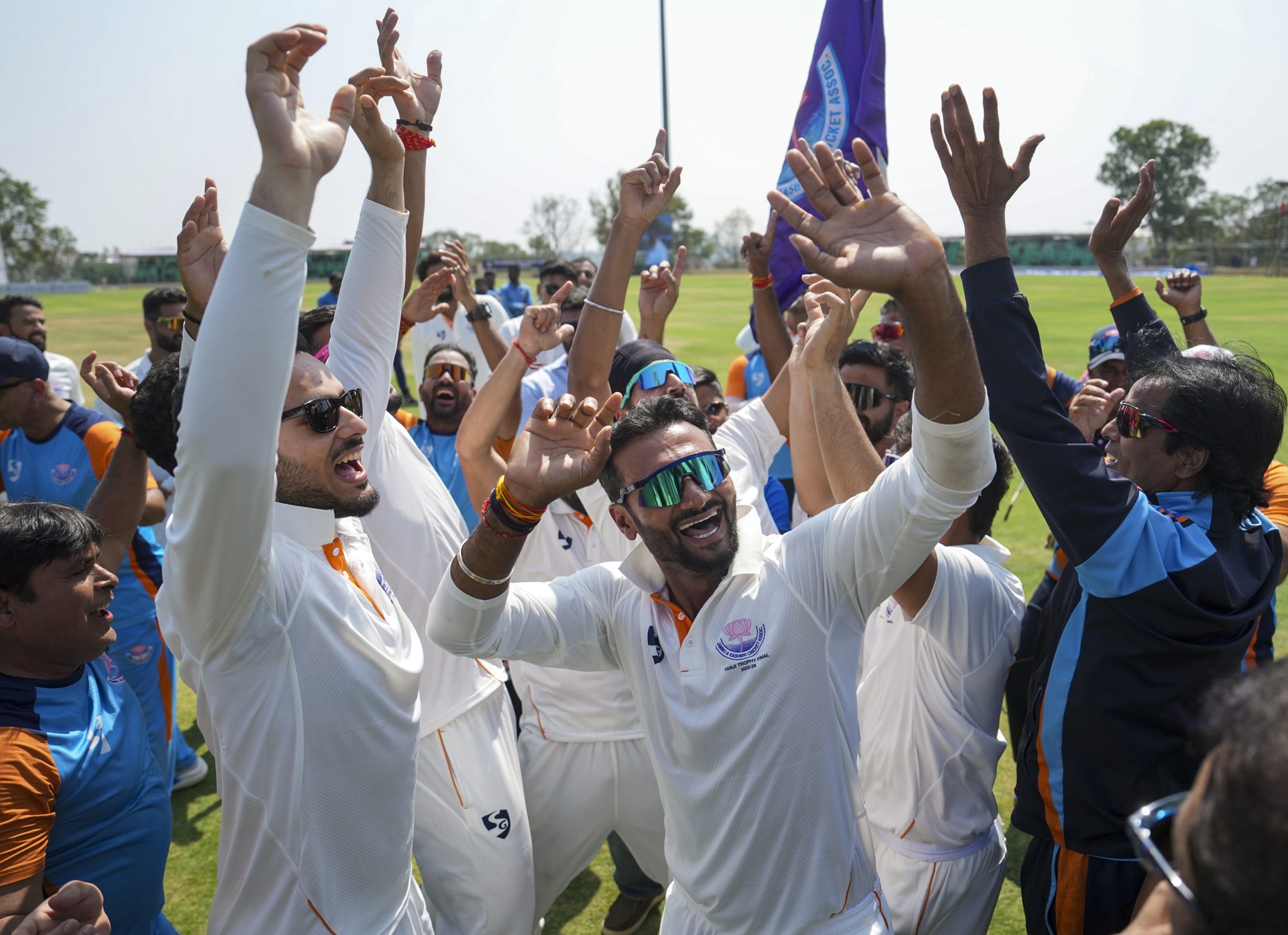 J&K team captain Paras Dogra, front centre, Abdul Samad, front left, and others celebrate after winning the Ranji Trophy 2025-26 final cricket match against Karnataka, February 28, 2026. Photo: Shailendra Bhojak/PTI.