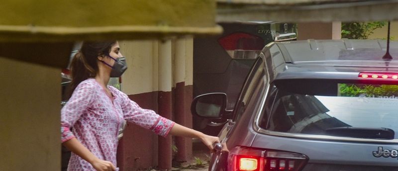 Rhea Chakraborty being hounded by the media outside the NCB office. Photo: PTI