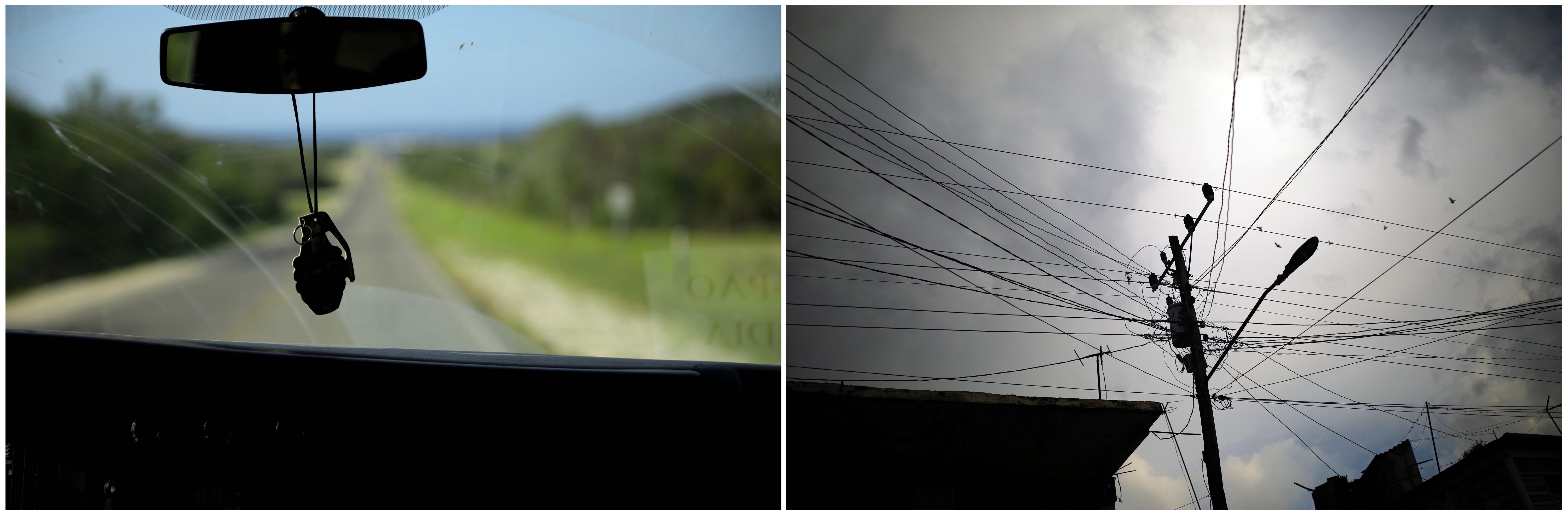 A combination picture shows a cardboard grenade hanging inside a military vehicle at the US Naval Base in Guantanamo Bay, Cuba, June 3, 2017 (L) and electricity wires over a busy street in the city of Guantanamo, Cuba, December 6, 2017. Credit: Reuters/Carlos Barria