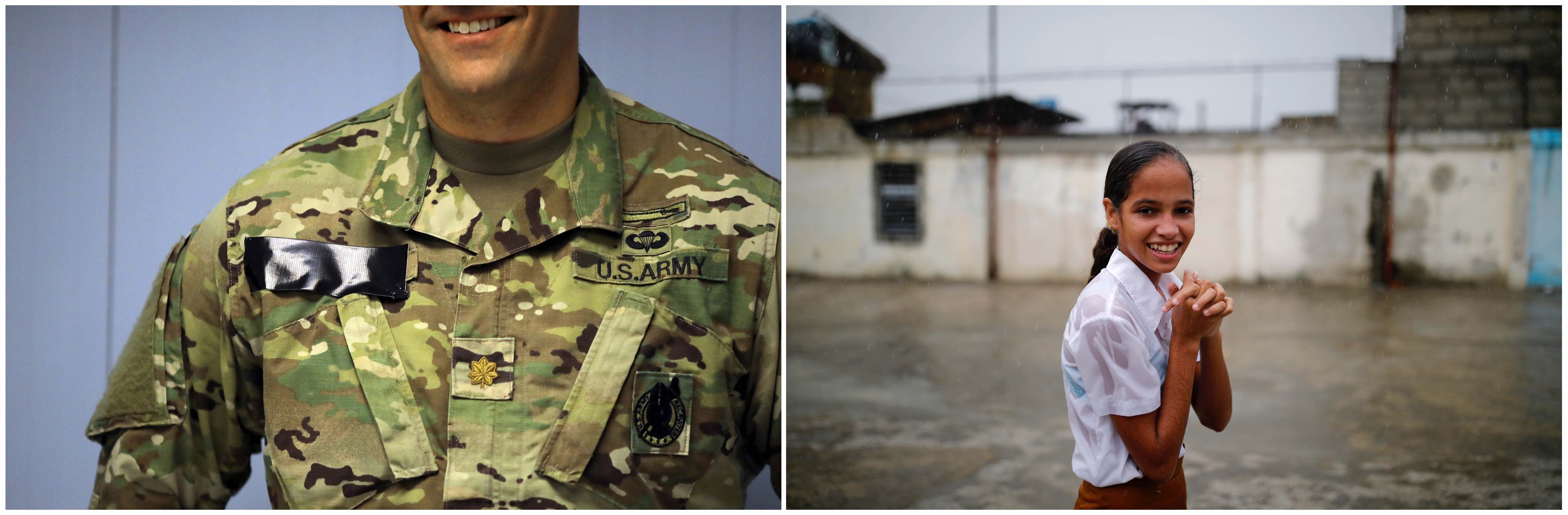 A combination picture shows an unidentified member of the US Army standing by an empty cell inside a prison at the US Naval Base in Guantanamo Bay, Cuba, June 3, 2017 (L) and a girl taking a break during a soccer game under heavy rain in the city of Guantanamo, Cuba, December 6, 2017. Credit: Reuters/Carlos Barria