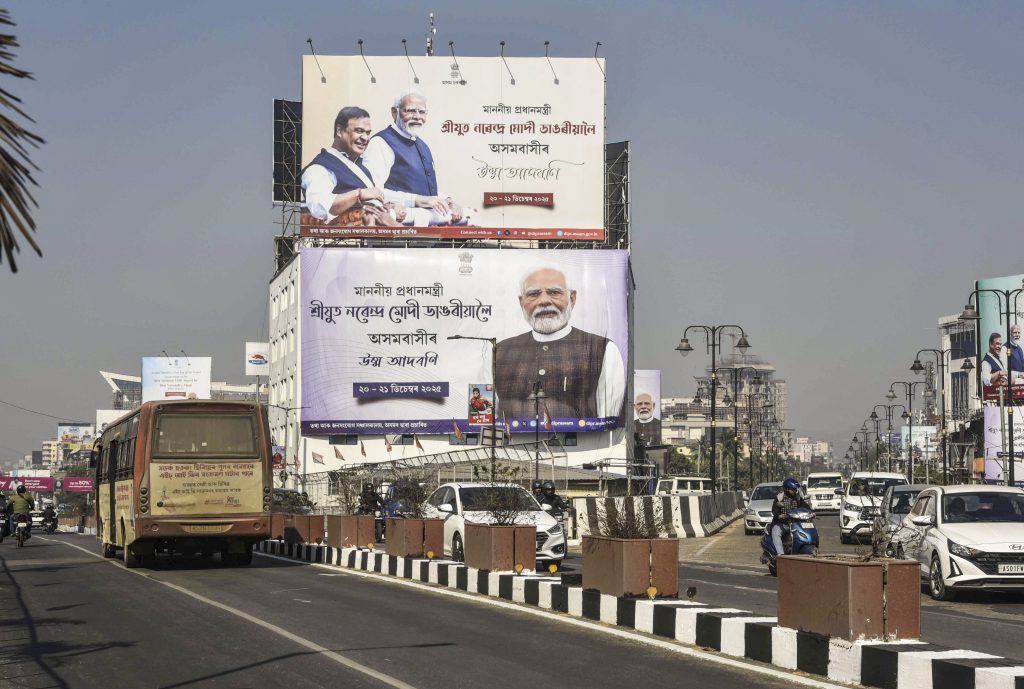 Commuters move along a city road as large billboards welcome Prime Minister Narendra Modi ahead of his two-day visit to Assam, in Guwahati, Thursday, Dec. 18, 2025. Photo: PTI.