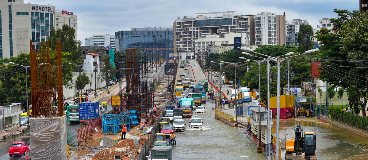 Vehicles on the waterlogged Outer Ring Road in Bellandur, September 7, 2022. Photo: PTI/Shailendra Bhojak