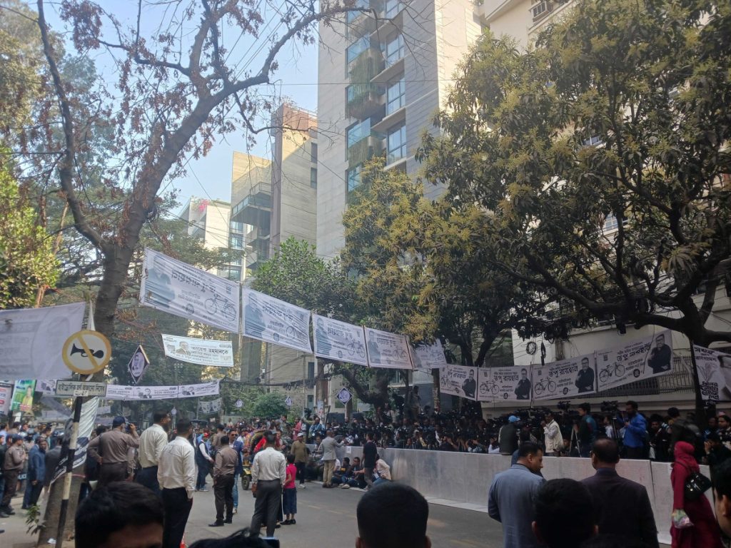 A large contingent of Bangladeshi and foreign media, including mainstream reporters, YouTubers and TikTokers, waited for hours outside the centre.