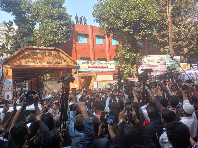 A large contingent of Bangladeshi and foreign media, including mainstream reporters, YouTubers and TikTokers, waited for hours outside the centre.
