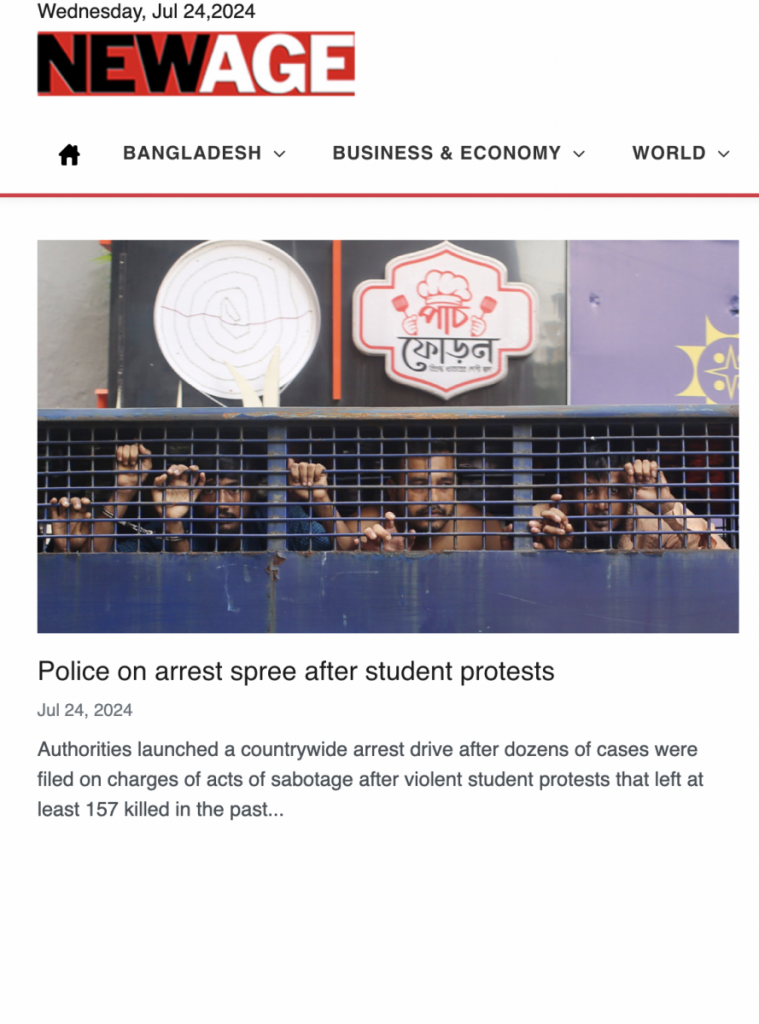 Newspapers also report Nobel laureate Muhammad Yunus bucking the government narrative with a statement to the international community on Monday, “Bangladesh has been engulfed in a crisis that only seems to get worse each passing day. High school students have been amongst the victims.”