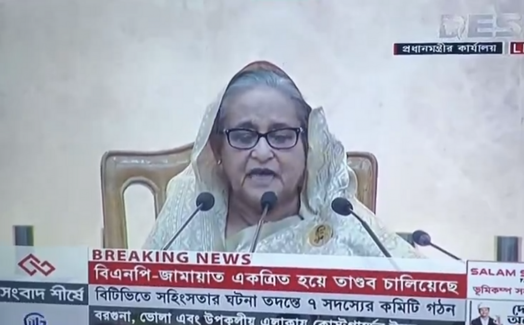 Video screengrab of a clip showing Hasina after her meeting with businesspersons.