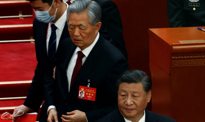 Hu, 79, Xi Jinping's immediate predecessor, was seated to the left of Xi. He was led off the stage of the main auditorium of the Great Hall of the People in Beijing by two stewards, a Reuters witness at the congress said.