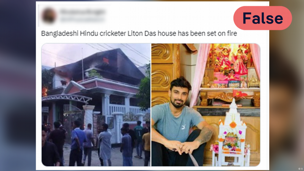 A post on X (formerly Twitter) alleged that the house of Liton Das, a famous Bangladeshi Hindu cricketer, had been set on fire, sharing a collage of two pictures as evidence.
