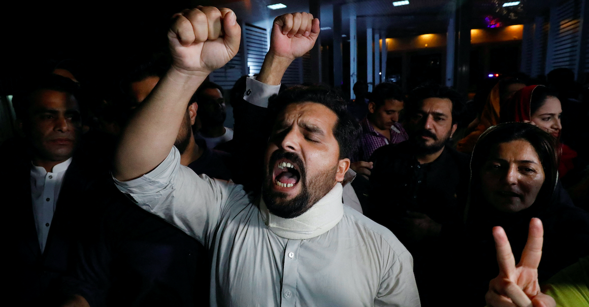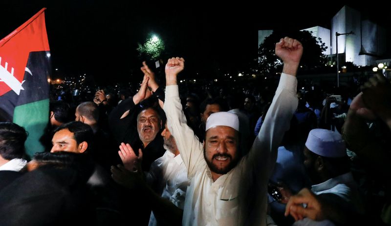 Supporters of former Pakistani Prime Minister Imran Khan chant slogans as they protest after he lost a confidence vote in the lower house of parliament, in Islamabad, Pakistan April 10, 2022. Photo: Reuters/Akhtar Soomro