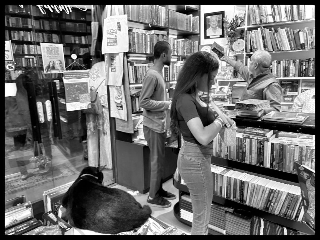 A cat at a bookstore in Dhaka.
