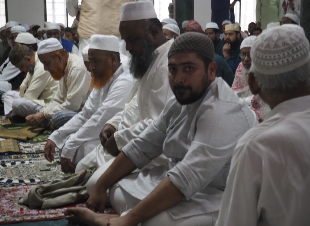 NCP leader and candidate, student leader Nahid Islam, at a mosque, at prayers between campaigns.