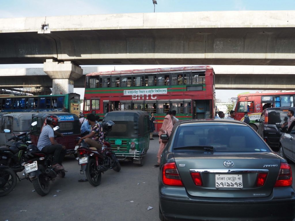 The metro plies and double decker busses run by BRTC snake in and out of a crowd of cars. Rickshaws rule the road.