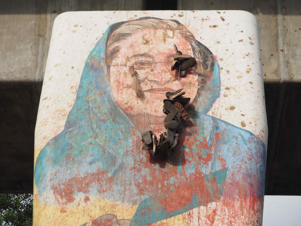 Hasina's portrait been vandalised. Shoes and brooms hang.