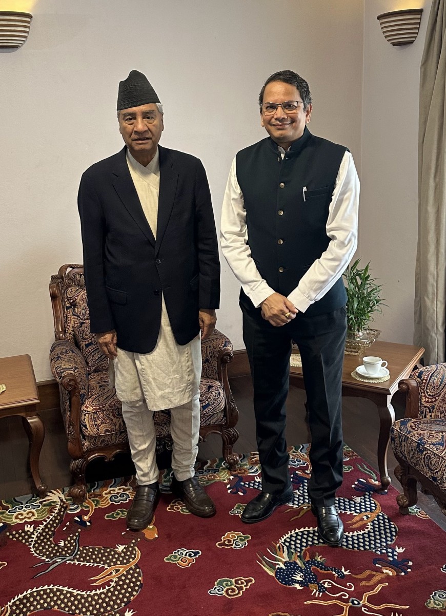 BJP's Vijay Chauthaiwale with former prime minister of Nepal Sher Bahadur Deuba. Photo: Twitter/@vijai63