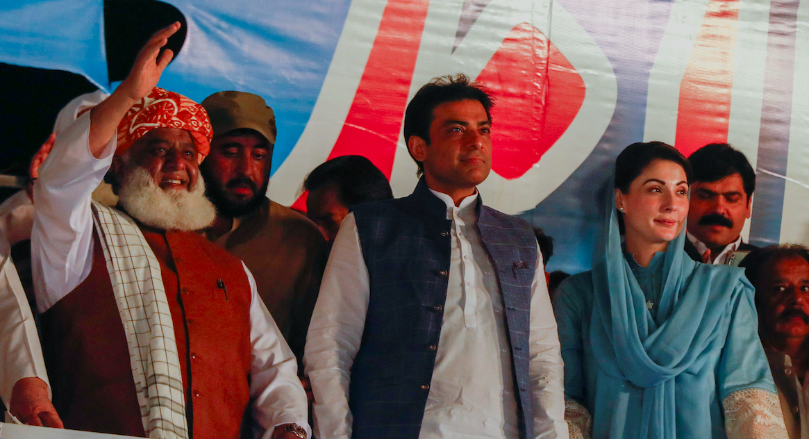 Leaders of the opposition parties Fazal-ur Rehman, president of the Jamiat Ulema-e-Islam-Fazal (JUI-F), Mian Muhammad Hamza Shehbaz Sharif, the son of Mian Muhammad Shehbaz Sharif and Maryam Nawaz, the daughter of Pakistan's former Prime Minister Nawaz Sharif, attend an anti-government rally organized by the Pakistan Democratic Movement (PDM), an alliance of political opposition parties, after the parliament took up a no-confidence motion moved by opposition lawmakers in a bid to remove Prime Minister Imran Khan, in Islamabad, Pakistan March 28, 2022. Photo: Reuters/Akhtar Soomro