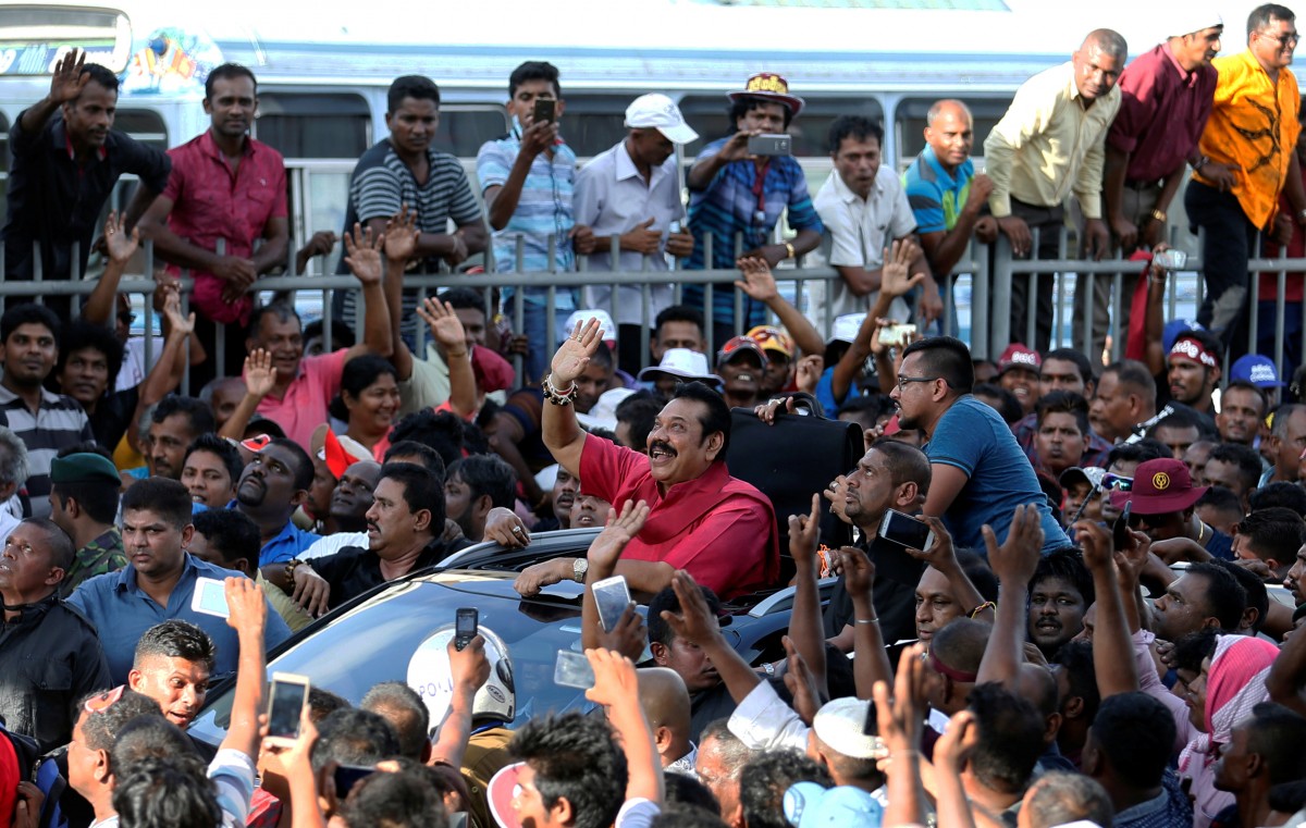 Mahinda Rajapaksa, then in the opposition, waves at his supporters during an anti-government protest in Colombo, Sri Lanka September 5, 2018. Photo: Reuters/Dinuka Liyanawatte