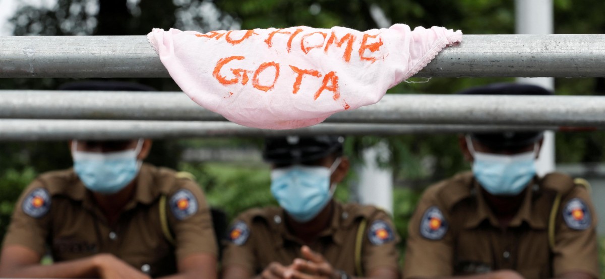 Pairs of underwear are placed by protestors on a temporary metal barrier made to block them at the main entrance to the parliament during the trade unions' nationwide Harthal demanding the resignation of President Gotabaya Rajapaksa and his cabinet and blaming them for creating the country's worst economic crisis in decades, in Colombo, Sri Lanka, May 6, 2022. Photo: Reuters/Dinuka Liyanawatte