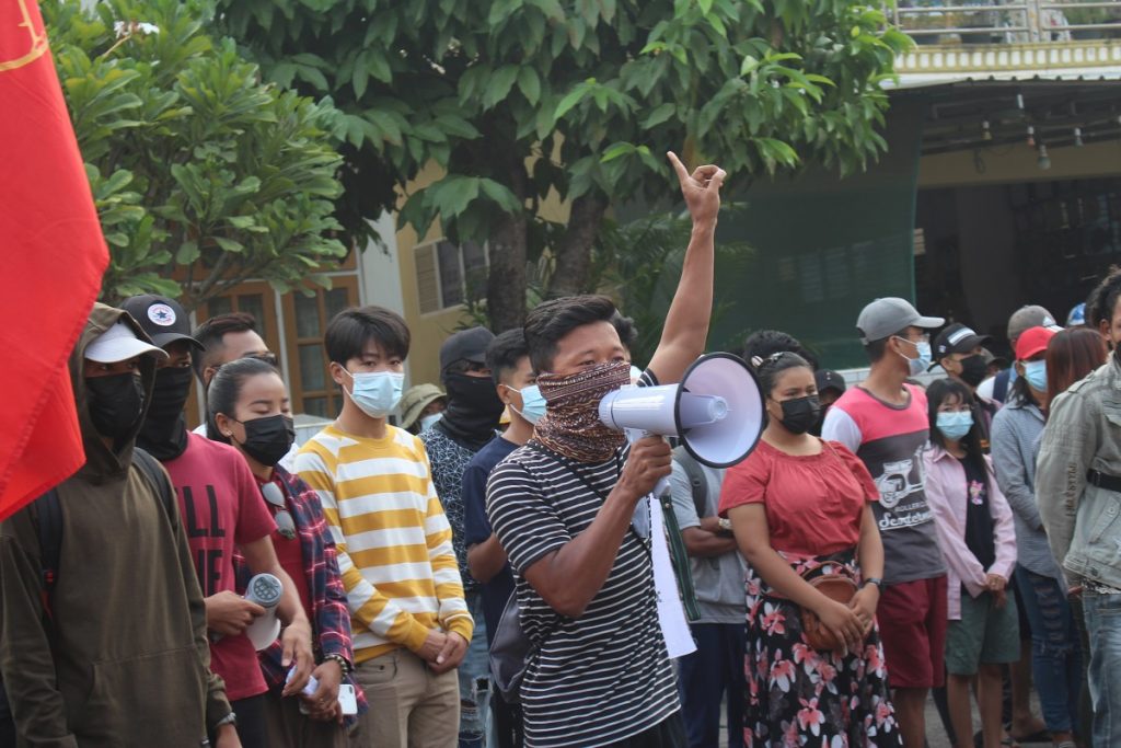 Demonstrator speaks using a bullhorn as university students and LGBT community members protest against the ongoing coup in Dawei, Myanmar, March 25, 2021 in this image obtained from social media. Photo: Dawei Watch via REUTERS