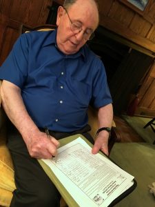 Dr Bernard Lown signing an India-Pakistan peace petition in 2017. Photo: Beena Sarwar