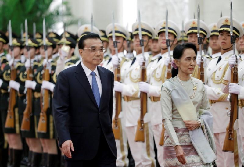 China's Premier Li Keqiang and Myanmar State Counselor Aung San Suu Kyi (right) review honour guards during a welcoming ceremony at the Great Hall of the People in Beijing, China, August 18, 2016. Credit: Reuters/Jason Lee