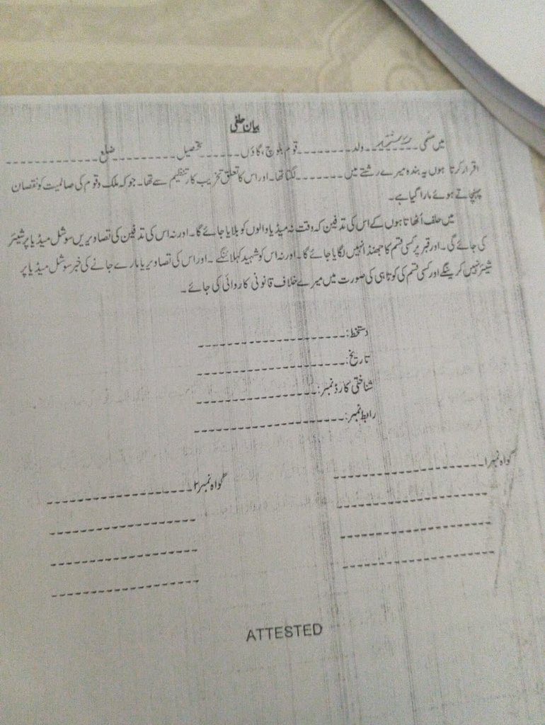 The document, written in Urdu, stated that Rashid must sign and acknowledge that his son, Israr, had been part of a terrorist organisation and was killed while “inflicting harm to the country.” The document further stated that they must not share pictures of Israr’s funeral or his grave on social media, nor call any media personnel or channels. It prohibited them from sharing the news of his killing on social media and calling him a martyr. The document concluded by stating that if they did not comply with these conditions, “legal action” would be taken.