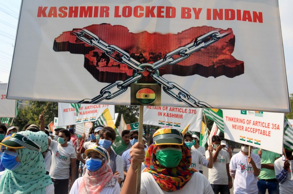 People carry signs during a protest against the Indian government's decision to dilute Article 370 during a march in Lahore, Pakistan, August 5, 2020. Photo: REUTERS/Mohsin Raza