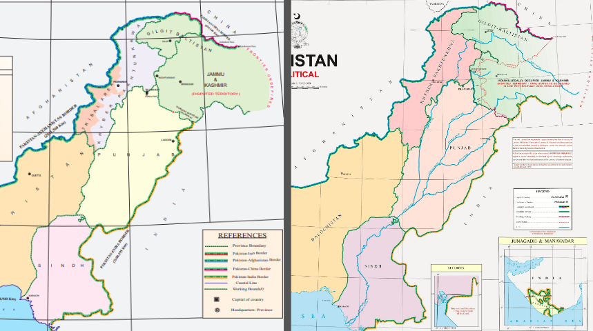In both maps, the Indian Union Territories of Jammu and Kashmir and Ladakh are shown as part of Pakistan