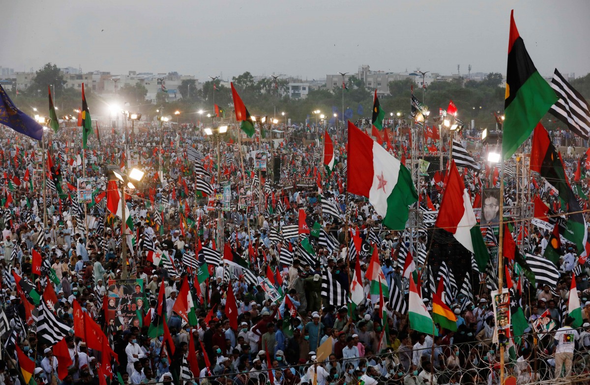 Supporters of the Pakistan Democratic Movement (PDM), an alliance of political opposition parties, wave flags as they listen to their leaders during an anti-government protest rally in Karachi, Pakistan October 18, 2020. Photo: Reuters/Akhtar Soomro.
