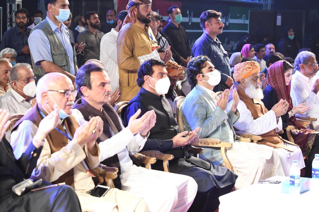 Leaders of the Pakistan Tehreek-e-InsafPakistan Democratic Movement gathered at a rally in Karachi against PM Imran Khan. Photo: Twitter.