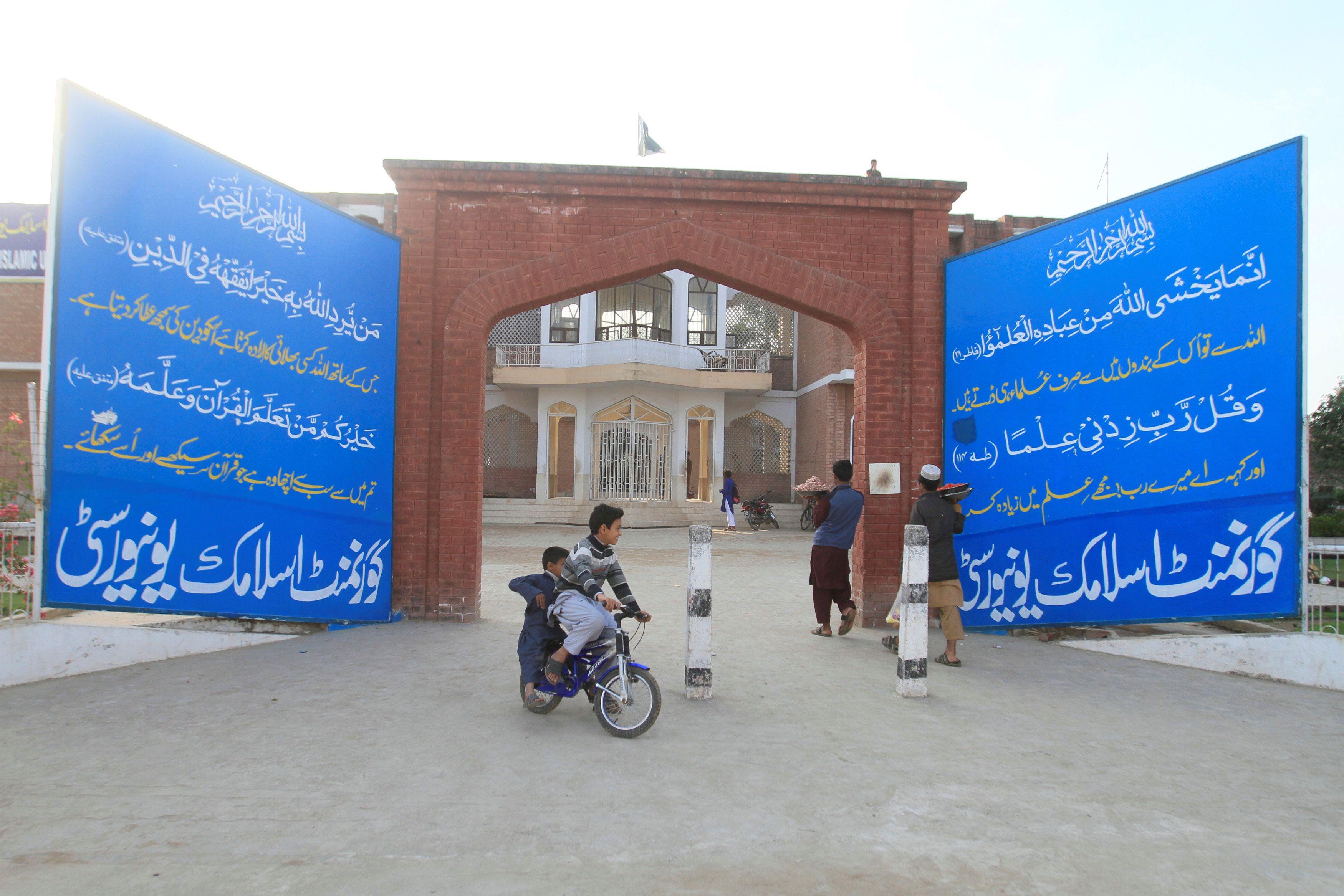 Children ride on a bicycle past the main gate of Government Islamic University, previously known as Jamia Al-Dawa Islamia, run by the Islamic charity organisation Jamaat-ud-Dawa (JuD) in Muridke near Lahore, Pakistan February 15, 2018. Credit: Reuters/Mohsin Raza
