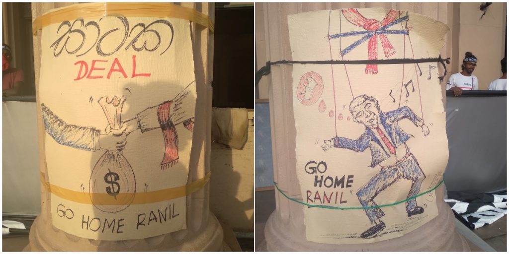 Bands of activists quickly turned out “Go Home Ranil” headbands, and by evening two artists had sketched a series of anti-Wickremesinghe posters that were taped to the secretariat’s pillars. The sketches effectively summed up the sentiment: Wickremesinghe is seen as a cunning deal-maker and unscrupulous politician, no different from the odious Rajapaksas.