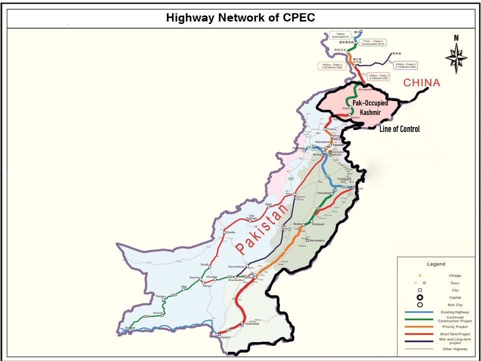 Road network of the China Pakistan Economic Corridor. The proposed roads pass through Pakistan-occupied Kashmir. Credit: Adapted from Wikimedia Commons