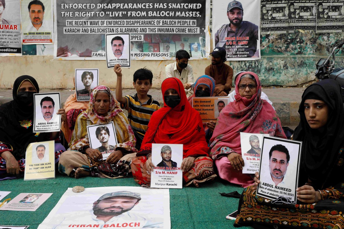 FILE PHOTO: Family members of missing or disappeared persons of the Baloch people hold portraits of their loved ones during a protest in Karachi, Pakistan July 1, 2022. REUTERS/Akhtar Soomro