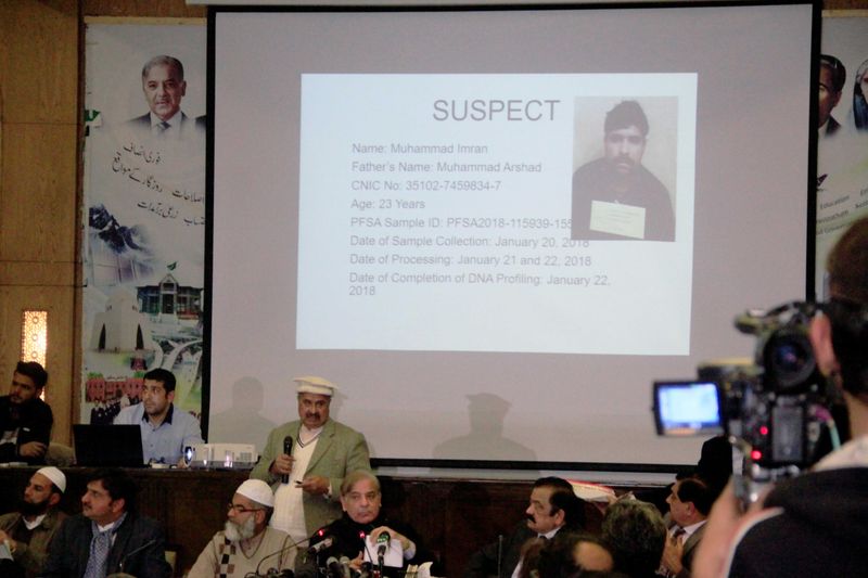 A slide showing a picture of Imran Ali, the serial killer responsible for the rape and murder of seven-year-old Zainab Ansari, is shown at a press conference in Lahore on January 23. Credit: Reuters/Mohsin Raza