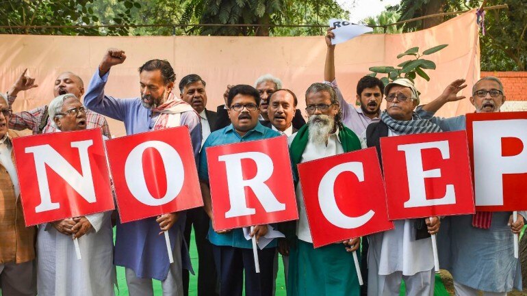 Swaraj India President Yogendra Yadav and members of All India Kisan Sangharsh Coordination Committee (AIKSCC) raise slogans against the possibility of India joining the RCEP in New Delhi. Photo: PTI/File