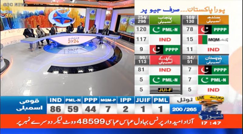 In the Punjab assembly, the PTI independents and Sharif's PML(N) are neck-and-neck, according to Geo TV's broadcast.