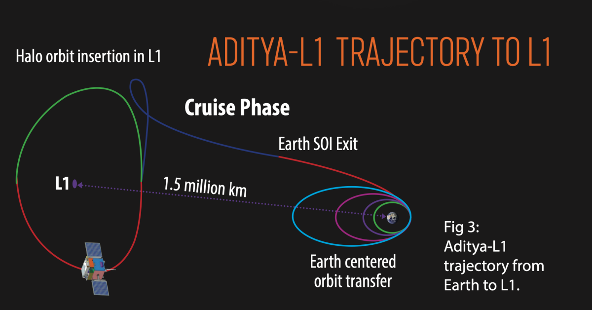 Initially, the spacecraft will be placed in a low earth orbit. The orbit is gradually made more elliptical, after which the spacecraft will be launched towards its destination: L1 refers or Lagrange point 1 (L1) of the Sun-Earth system, which is about 1.5 million km from the Earth.
