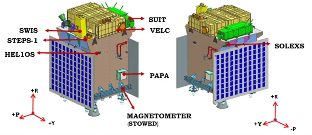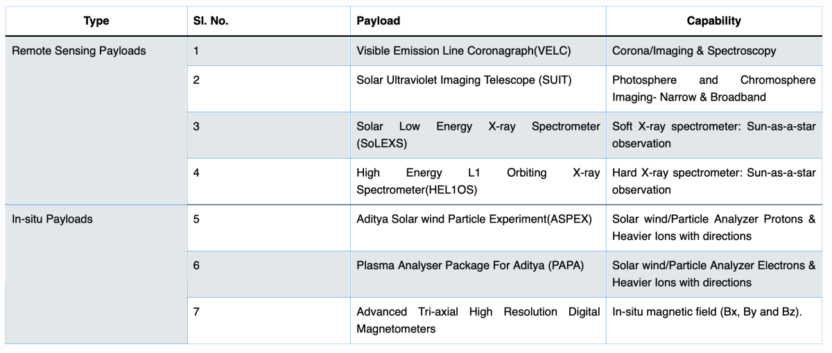 The spacecraft carries seven payloads to observe the photosphere, chromosphere and the outermost layers of the Sun, called the corona, using electromagnetic, particle and magnetic field detectors. Four payloads will directly view the Sun and the remaining three payloads will carry out in-situ studies of particles and fields, "providing important scientific studies of the propagatory effect of solar dynamics in the interplanetary medium", according to ISRO. The space agency plans to understand phenomena like the problem of coronal heating, coronal mass ejection, pre-flare and flare activities and their characteristics, and the dynamics of space weather.