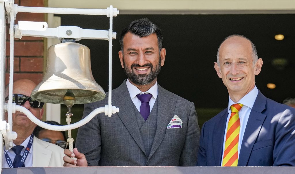 Indian cricketer Cheteshwar Pujara rings the five-minute bell before the start of the third day of the third Test match between India and England, at the Lord's Cricket Ground, in London, Saturday, July 12, 2025. Photo: PTI.