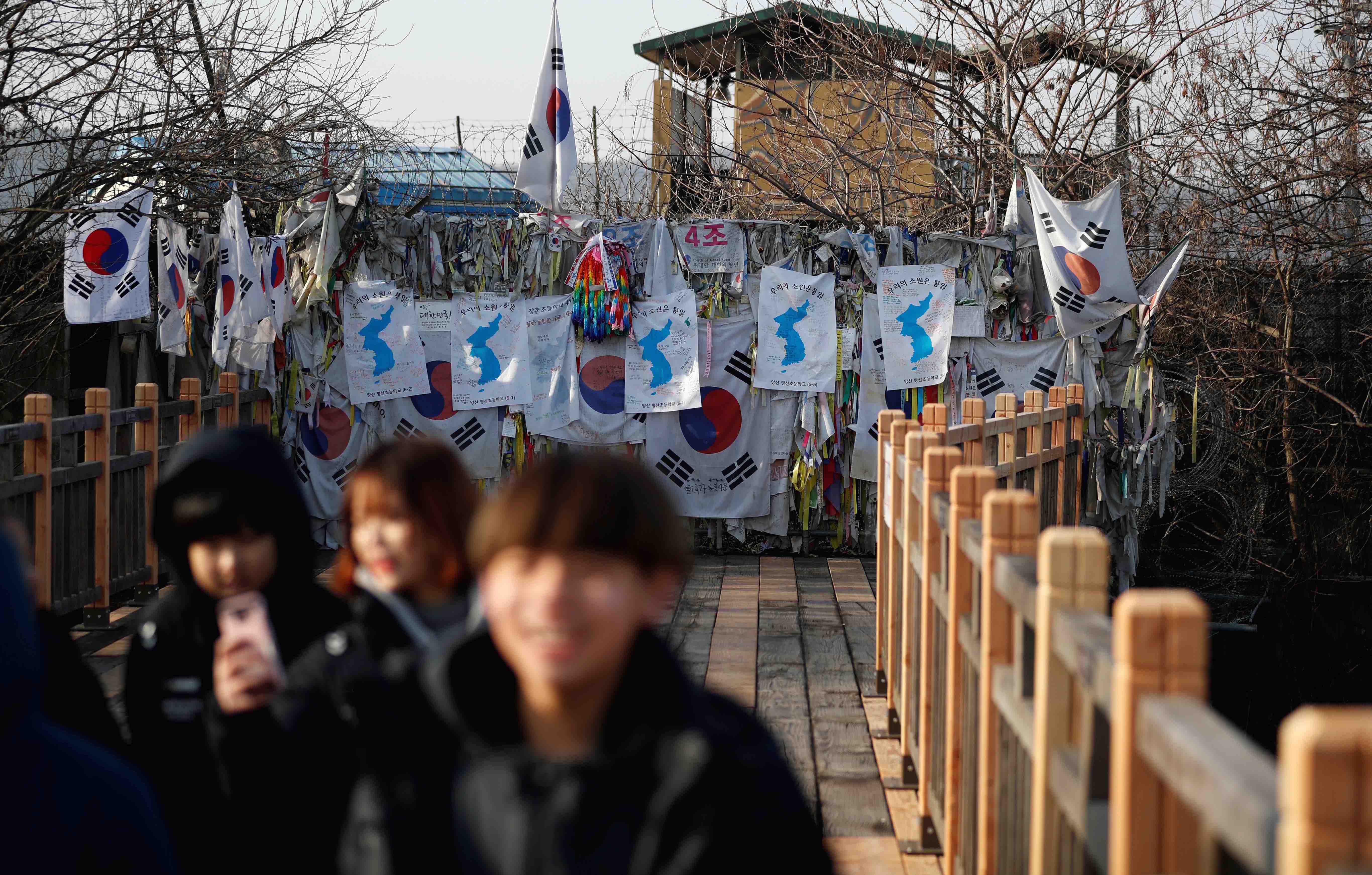 Unification flags hang on a military fence near the demilitarised zone (DMZ) separating the two Koreas in Paju, South Korea, on January 19. Credit: Reuters/Kim Hong-Ji/Files