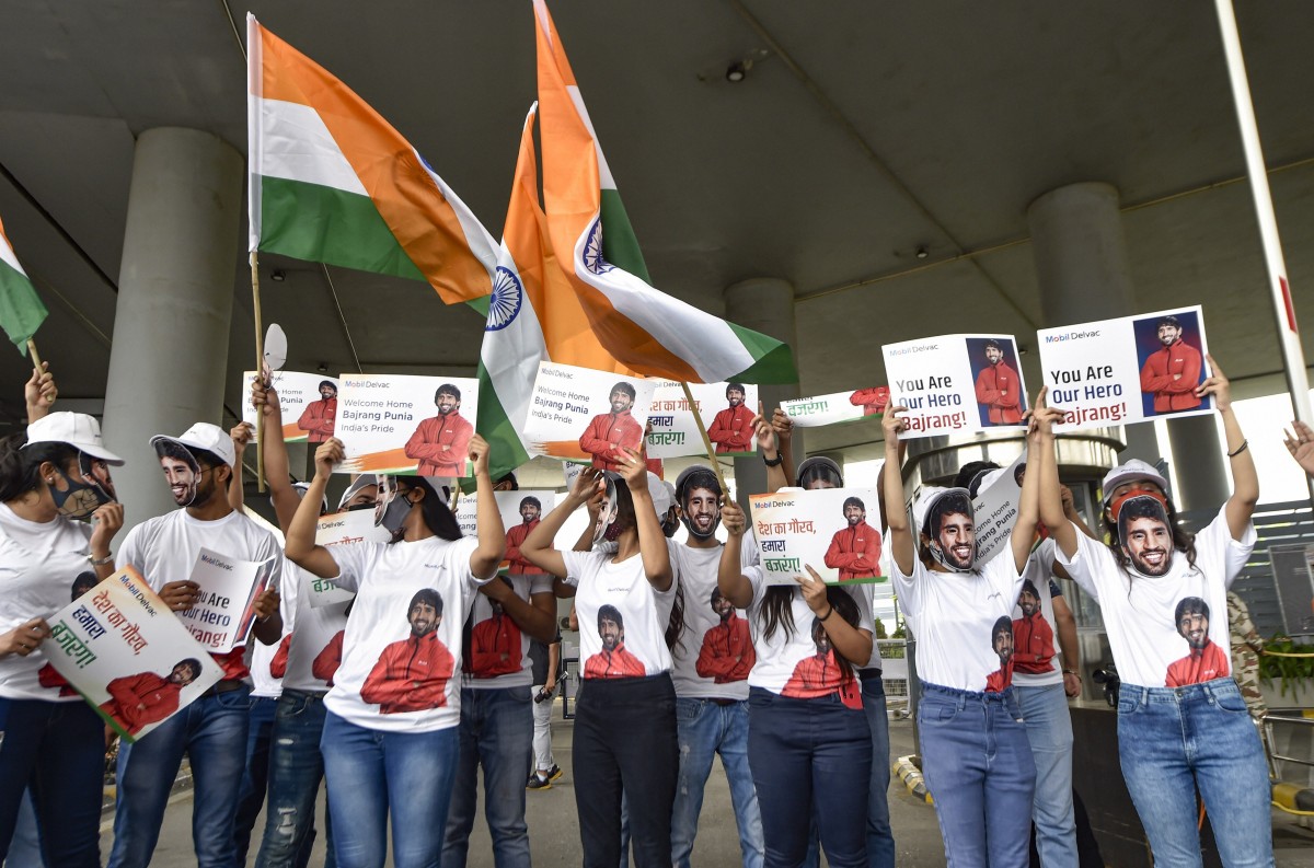 People wear masks and hold posters of Bronze medalist wrestler Bajrang Punia, to welcome him on his arrival at IGI Airport, after the end of the Tokyo Summer Olympics 2020, in New Delhi, Monday, Aug. 9, 2021. Photo: PTI/Ravi Choudhary